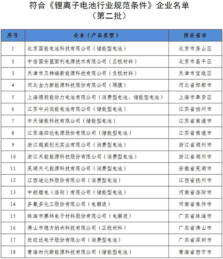 符合《锂离子电池行业规范条件》企业名单(第二批)