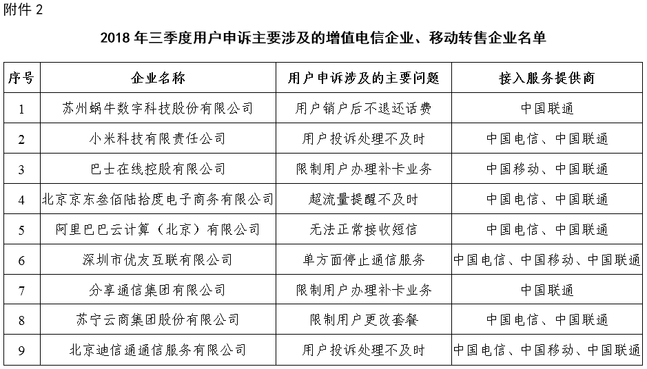 2.2018年三季度用户申诉主要涉及的增值电信企业、移动转售企业名单