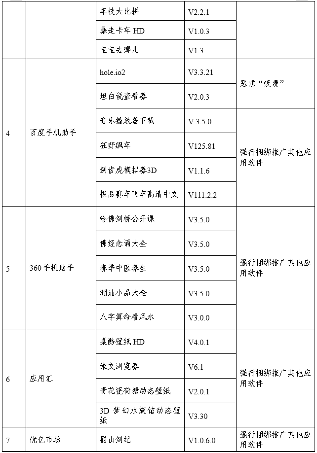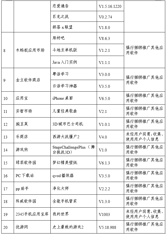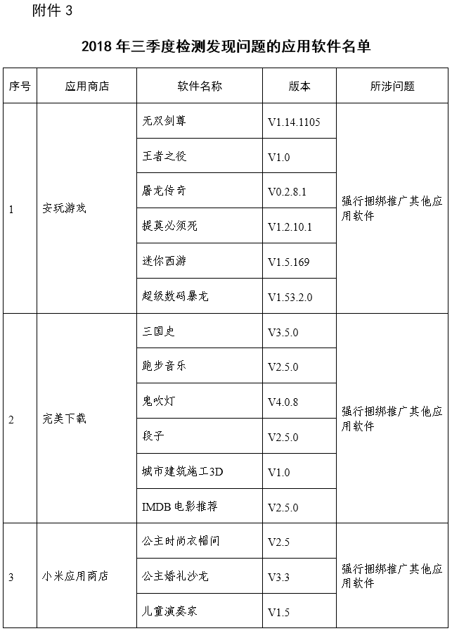 (四)三季度,工业和信息化部组织对48家手机应用商店的应用软件进行技术检测,发现违规软件53款,涉及违规收集使用用户个人信息、恶意“吸费”、强行捆绑推广其他应用软件等问题(详见附件3),已责令下架。工业和信息化部组织对62家互联网企业65项互联网服务进行抽查,发现12家互联网企业存在未公示用户个人信息收集使用规则、未告知查询更正信息的渠道、未提供账号注销服务的问题(详见附件4),已督促整改。