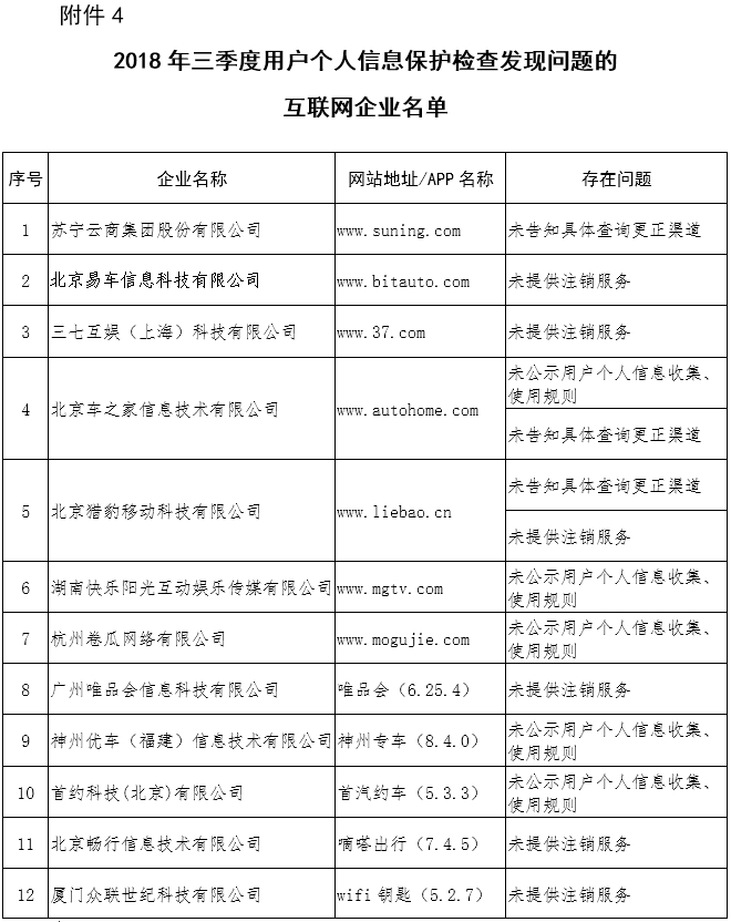 4.2018年三季度用户个人信息保护检查发现问题的互联网企业名单