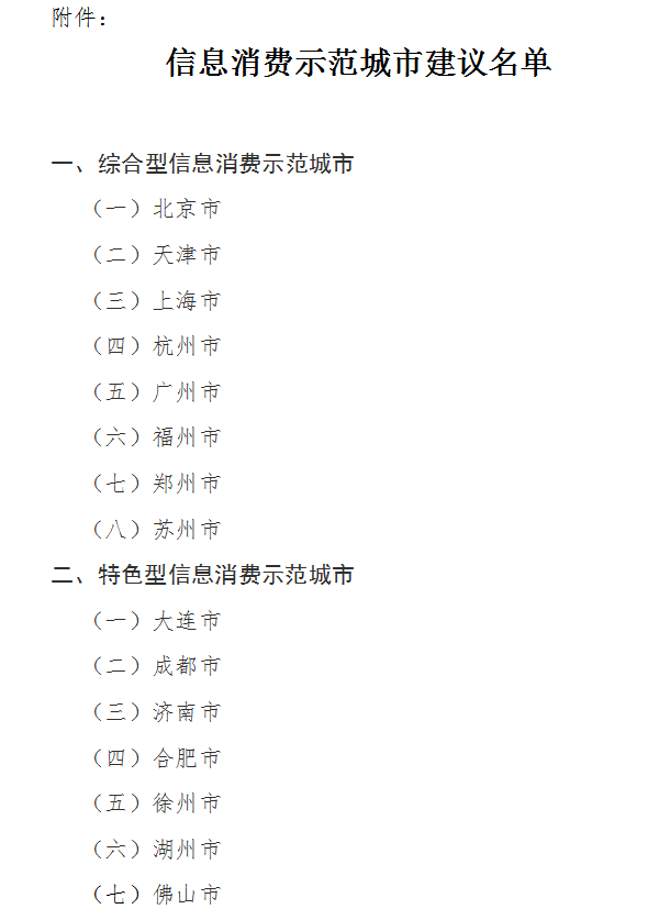 根据《信息消费示范城市建设管理办法(试行)》(工信部信软〔2019〕63号)有关要求,工业和信息化部组织开展信息消费示范城市动态管理。经城市申报、专家评审、现场答辩,拟遴选出综合型信息消费示范城市8个,特色型信息消费示范城市7个,现予以公示。如有异议,请于12月27日前以书面或电话形式反馈工业和信息化部信息化和软件服务业司。