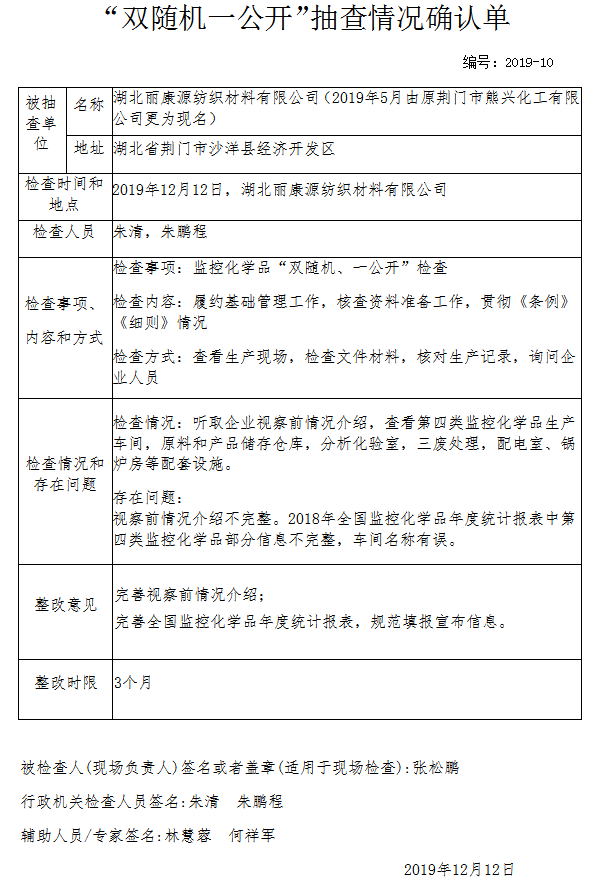 为进一步规范监控化学品专项监督检查执法行为,增强执法检查的公正性和透明度,提高监管效能,按照《监控化学品“双随机、一公开”抽查实施办法》规定,国家履行《禁止化学武器公约》工作办公室随机抽取了2名执法检查人员、2名专家组成检查组,并从监控化学品生产、经营及使用企业名录库中随机选取了湖北丽康源纺织材料有限公司(原荆门市熊兴化工有限公司)。检查组于2019年12月12日对该企业进行了现场检查。现将检查结果公示,欢迎社会各界监督。
