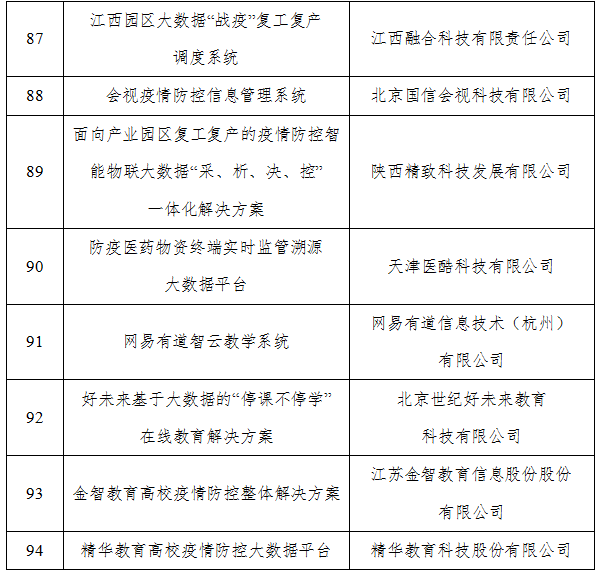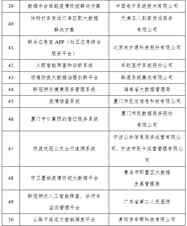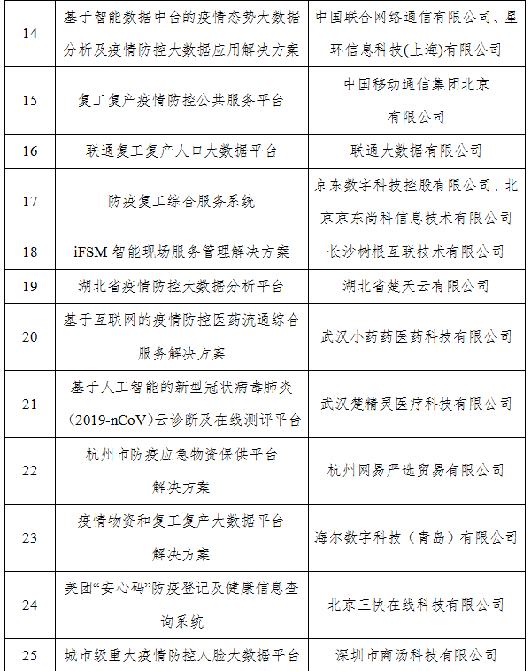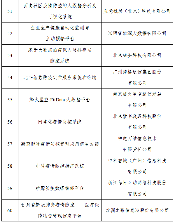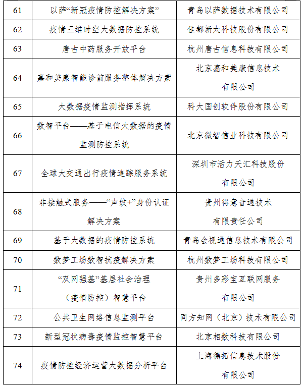 根据《工业和信息化部办公厅关于组织开展支撑疫情防控和复工复产复课大数据产品和解决方案征集工作的通知》(工信厅信发函〔2020〕31号)要求,工业和信息化部组织开展了相关申报和评审工作。现将拟入选名单进行公示,请社会各界监督。