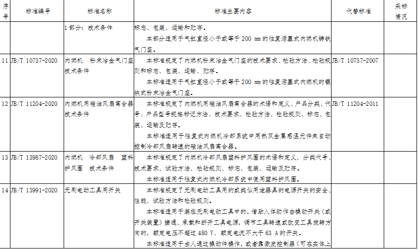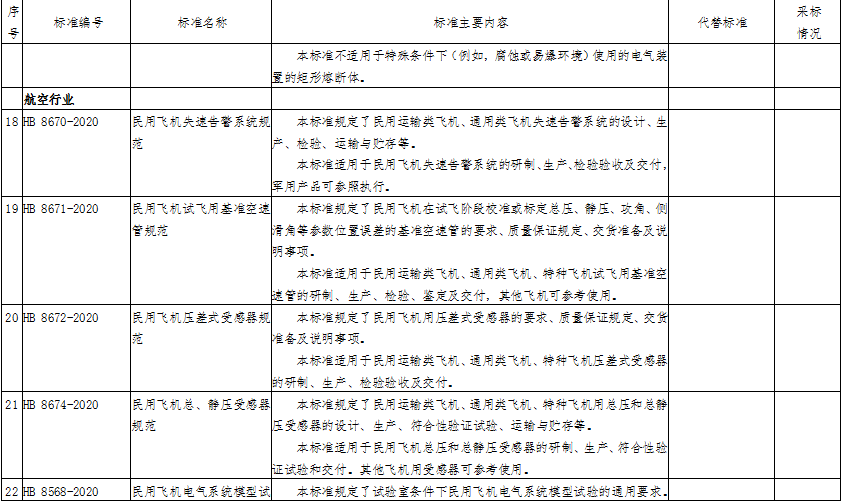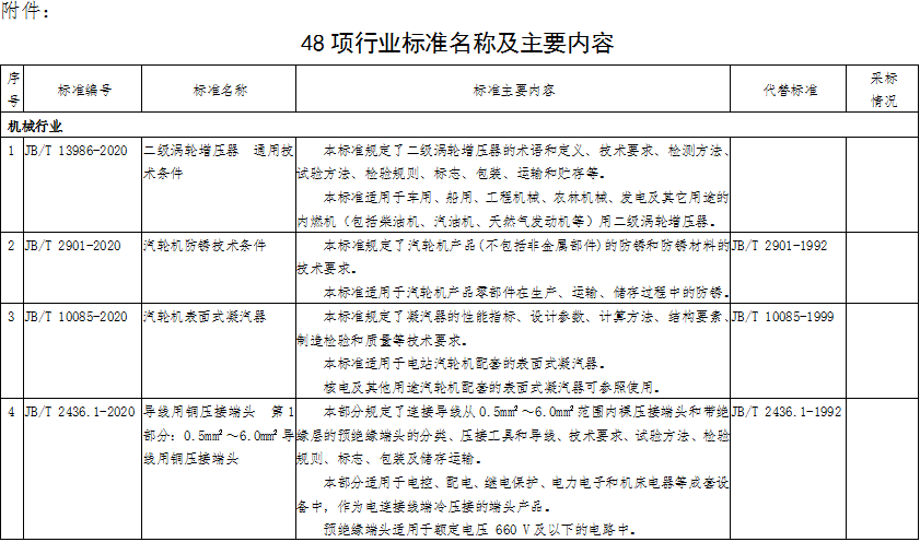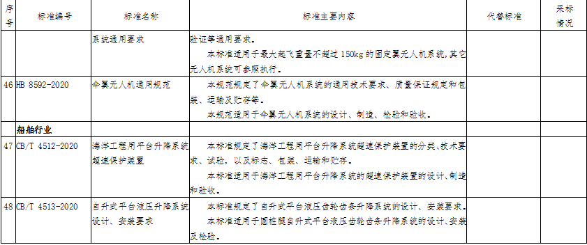 根据行业标准制修订计划,相关标准化技术组织已完成《汽轮机防锈技术条件》等17项机械行业标准、《民用飞机失速告警系统规范》等29项航空行业标准、《海洋工程用平台升降系统超速保护装置》等2项船舶行业标准的制修订工作。在以上标准批准发布之前,为进一步听取社会各界意见,现予以公示,截止日期2020年5月17日。