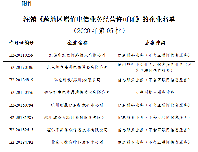 近期,东莞市东信网络技术有限公司等8家企业向工业和信息化部申请终止经营相关增值电信业务。为维护电信用户合法权益,妥善解决用户善后问题,根据《电信业务经营许可管理办法》(工业和信息化部令第42号)规定,现公示拟注销跨地区增值电信业务经营许可的相关信息(详见附件),公示期为2020年4月22日至2020年5月21日。