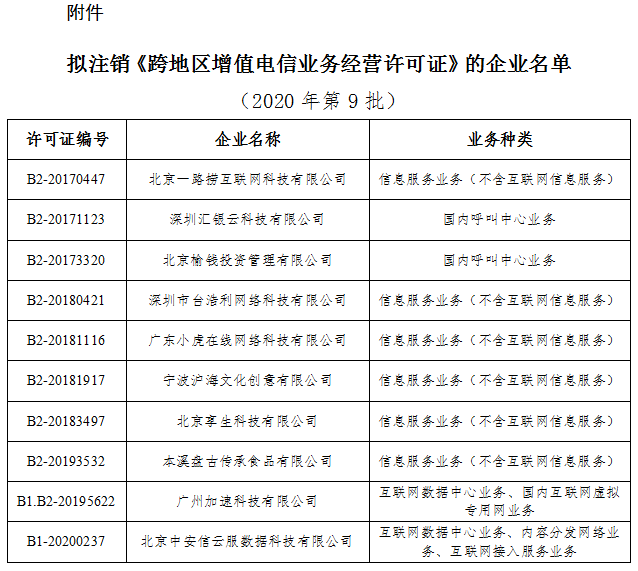 近期,北京一路捞互联网科技有限公司等10家企业向工业和信息化部申请终止经营相关增值电信业务。为维护电信用户合法权益,妥善解决用户善后问题,根据《电信业务经营许可管理办法》(工业和信息化部令第42号)规定,现公示拟注销跨地区增值电信业务经营许可的相关信息(详见附件),公示期为自2020年7月7日起至2020年8月6日。