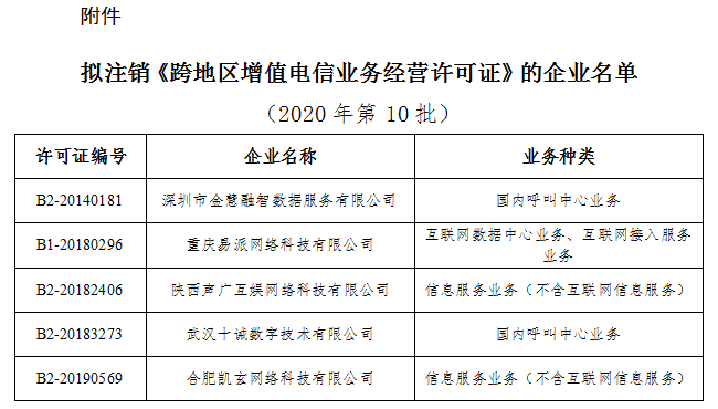 近期,深圳市金慧融智数据服务有限公司等5家企业向工业和信息化部申请终止经营相关增值电信业务。为维护电信用户合法权益,妥善解决用户善后问题,根据《电信业务经营许可管理办法》(工业和信息化部令第42号)规定,现公示拟注销跨地区增值电信业务经营许可的相关信息(详见附件),公示期为自2020年7月23日起至2020年8月22日。