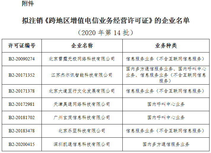 近期,北京雷霆无极网络科技有限公司等7家企业向工业和信息化部申请终止经营相关增值电信业务。为维护电信用户合法权益,妥善解决用户善后问题,根据《电信业务经营许可管理办法》(工业和信息化部令第42号)规定,现公示拟注销跨地区增值电信业务经营许可的相关信息(详见附件),公示期为自2020年9月9日起至2020年10月8日。