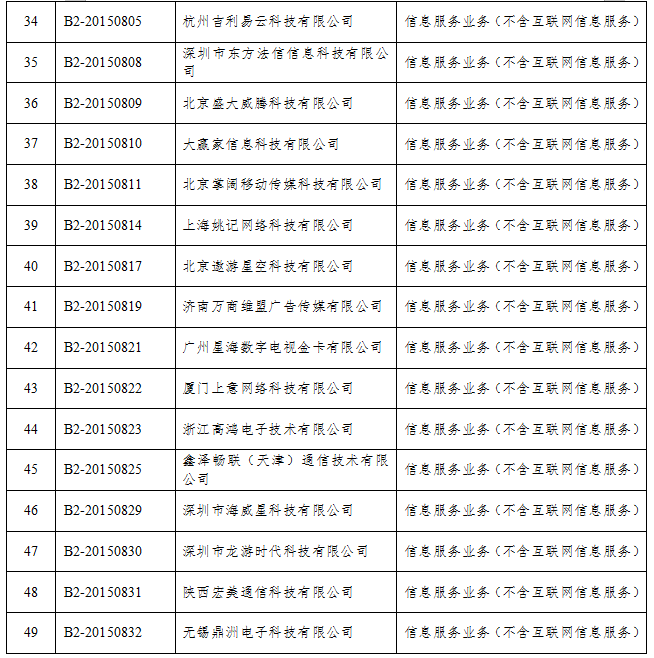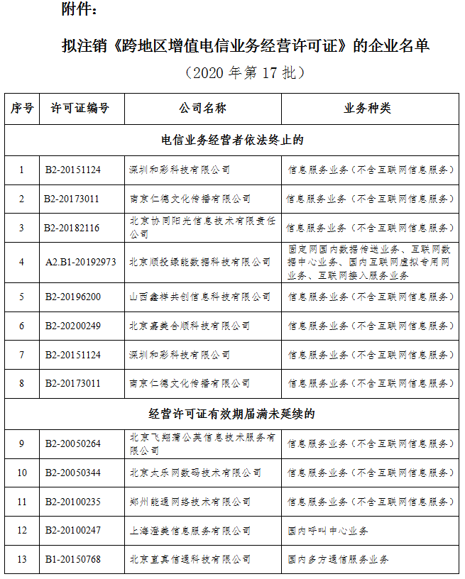 近期,深圳和彩科技有限公司等8家企业,在经营许可证的有效期内,按照规定期限向工业和信息化部申请终止经营相关增值电信业务;北京飞翔蒲公英信息技术服务有限公司等41家企业,经营许可证有效期届满,未在规定期限内向工业和信息化部申请延续经营相关增值电信业务或不符合许可延续规定。为维护电信用户合法权益,妥善解决用户善后问题,根据《电信业务经营许可管理办法》(工业和信息化部令第42号)规定,现公示拟注销跨地区增值电信业务经营许可的相关信息(详见附件),公示期为自2020年10月23日起至2020年11月22日。