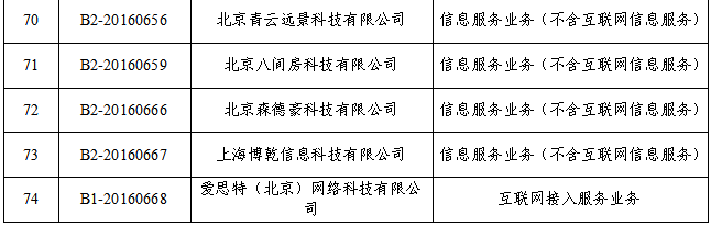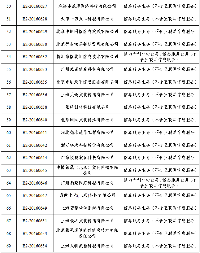 近期,上海通福电信工程有限公司等6家企业,在经营许可证的有效期内,按照规定期限向工业和信息化部申请终止经营相关增值电信业务;北京中科奥科技有限公司等68家企业,经营许可证有效期届满,未在规定期限内向工业和信息化部申请延续经营相关增值电信业务。为维护电信用户合法权益,妥善解决用户善后问题,根据《电信业务经营许可管理办法》(工业和信息化部令第42号)规定,现公示拟注销跨地区增值电信业务经营许可的相关信息(详见附件),公示期为自2021年6月3日起至2021年7月3日。